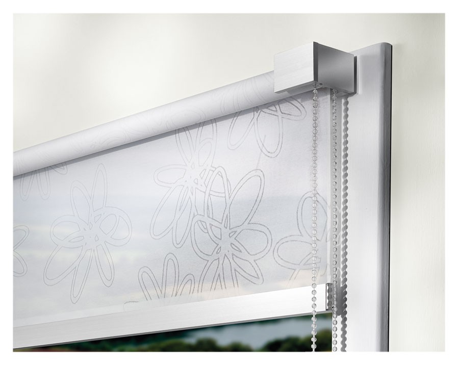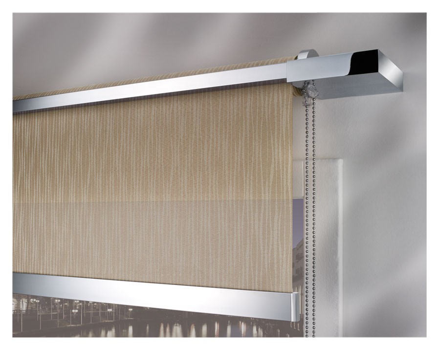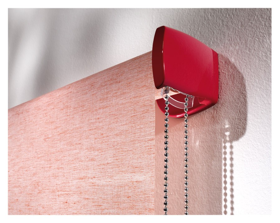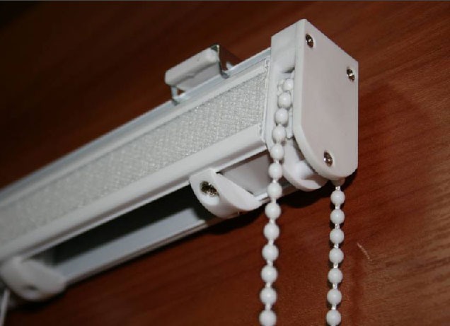 Другая разновидность карнизов для римских штор — роторно-цепочные. Здесь движение полотна осуществляется механически. Регулировка и управление шторами производится с помощью системы цепочек. Это надежный и доступный по цене карниз, который выдерживает больший вес полотна, около 7 кг. Ширина и высота штор, управляемых роторно-цепочным карнизом должна составлять не более 3,5 метров.