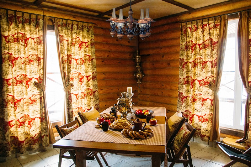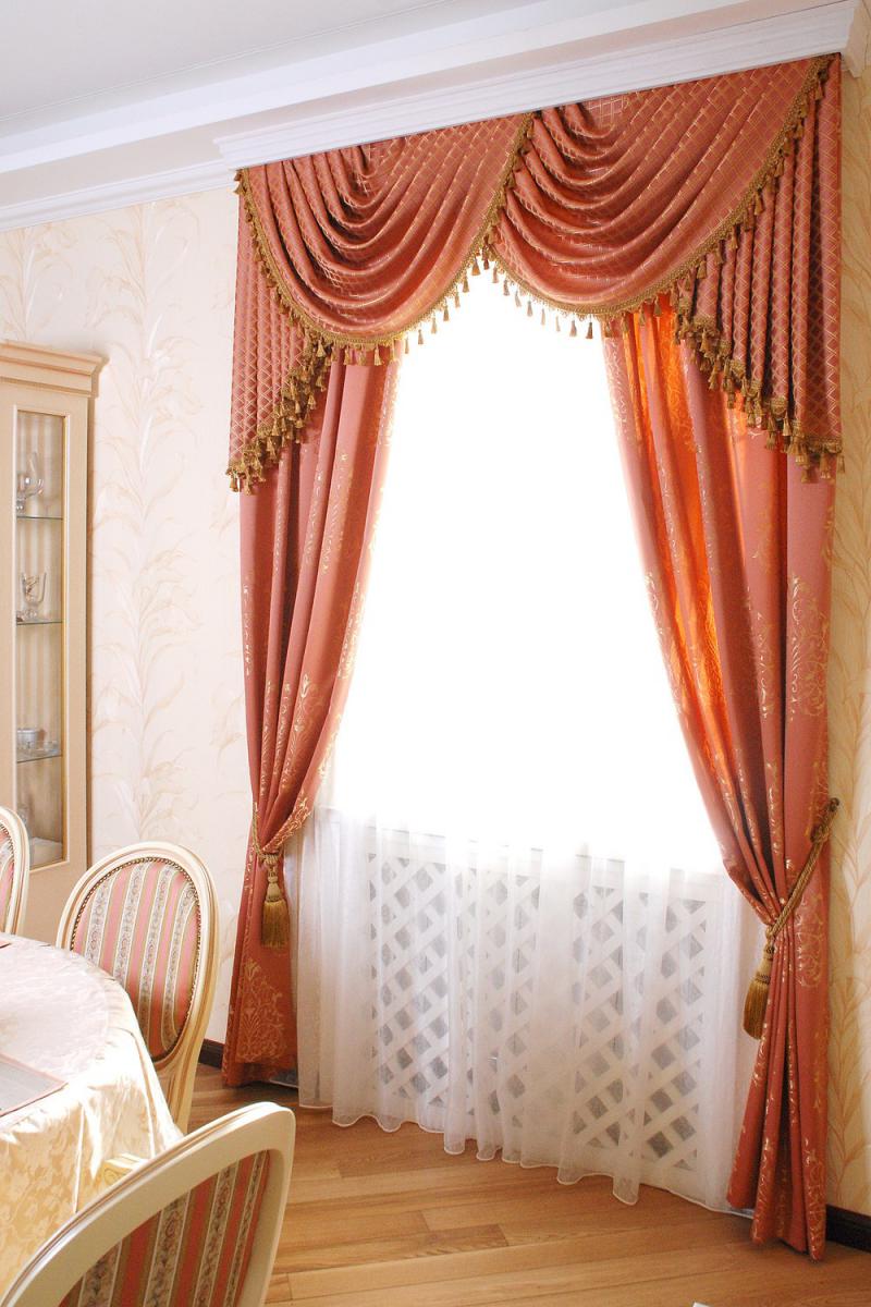 Шторы для столовых — нечто среднее между кухонными шторами и шторами для жилых комнат. Для столовых лучше подходят теплые тона, например, золотистые, персиковые, оранжевые, теплые оттенки зеленого. В столовых можно использовать легкие и светлые ткани, тюль, органзу, тафту.